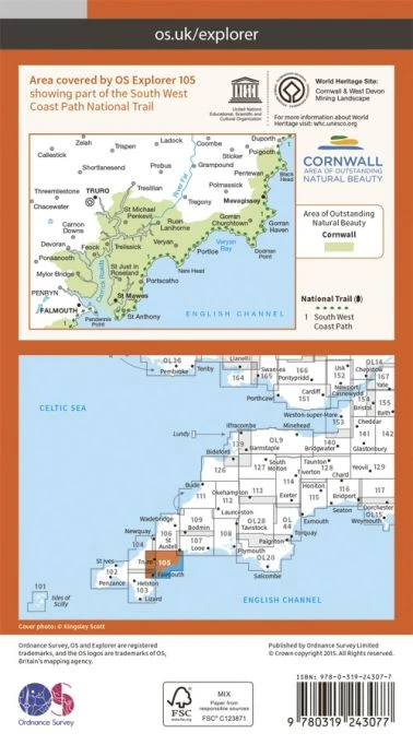 Map sheet number 105 in the OS Explorer map series is the ideal map for walks, hikes and rides around Falmouth, Mevagissey, Truro and St Mawes. The South West Coast Path is an ideal way to explore the coastline in this part of Cornwall. Highlights of the area include: Pendennis Point, Lost Gardens of Heligan, Mevagissey, Veryan Bay, and Falmouth Bay.