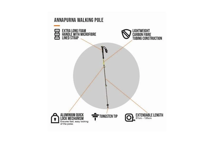 The new Vango Annapurna walking pole has been designed using super strong, lightweight carbon fibre tubing for your most challenging climbs. The extra long foam handle allows multiple hand positions and maximum comfort, while QuickLock technology ensures fast and easy locking of the poles.