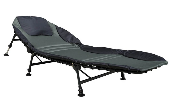 An extremely comfortable and very stable WSB 6-leg bed chair in 2-tone Oxford material featuring an integral pillow, adjustable pivoting mud feet and a reclining system.